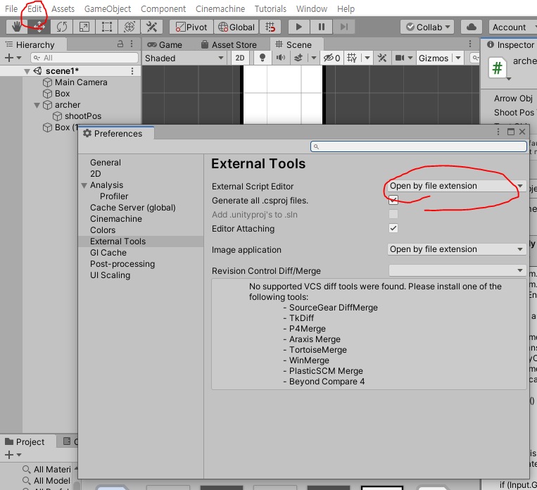 1. Unity 내부 상단바에서 [Edit] -> [Preferences..] -> [External Tools]