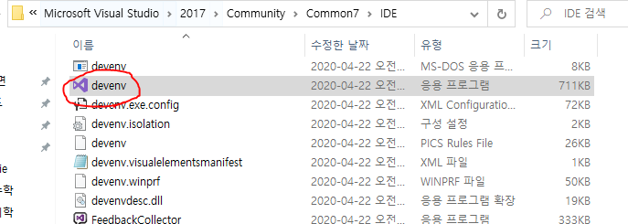 3. visual studio 파일 위치를 열어서 [devenv] 열기