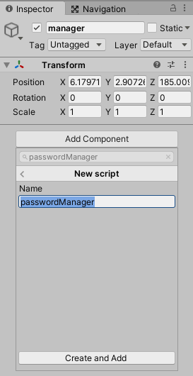 2) 새로운 게임 오브젝트(manager)를 만들어주고 passwordManager라는 새로운 스크립트를 만들고 아래 코드처럼 inputfied를 넣을 곳을 만들어준 후 오브젝트에 만들어둔 input field를 넣어준다.
