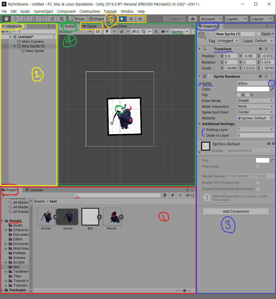Order in Layer: Sorting Layer와 비슷한 기능인데 Sorting Layer에서 같은 레이어 안에 있는 오브젝트의 순서를 정한다. (0부터 숫자를 써서 설정. 숫자가 적을 수록 뒤에 있는 이미지)