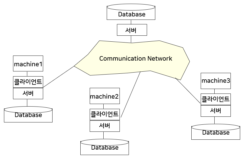 2_ 클라이언트는 여러 서버에 동시에 액세스할 수 있을 수 있는 경우. 즉, 단일 데이터베이스 요청이 여러 서버의 데이터를 결합할 수 있을 수 있다. 서버는 클라이언트를 단일 서버인 것처럼 바라본다. 분산 데이터베이스 시스템으로 "투명성"을 유지하기 위해 쓰인다.