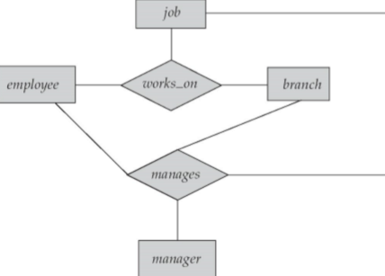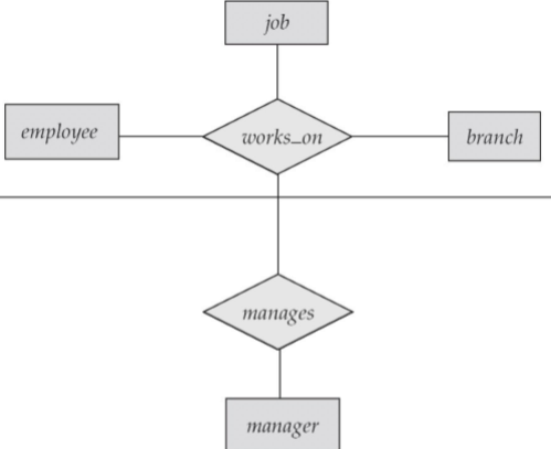 ※ 아래 그림에서 모든 manages는 work_on와 연결되지만 모든 woks_on는 manages에 연결되지 않기 때문에 이 둘은 중첩된다. 중첩을 지우기 위해 관계들 사이에 추상적인 개체의 관계를 만들어 그 밑의 그림처럼 바꿔줄 수 있다.