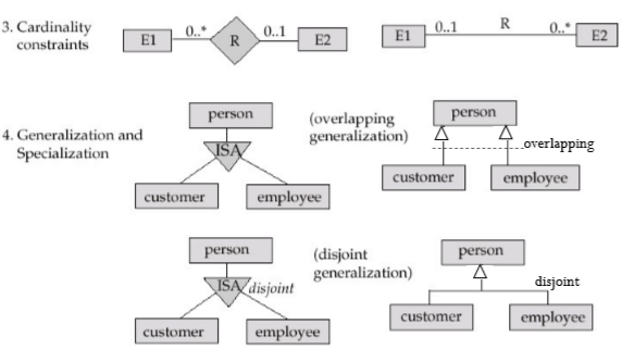 3) 카디널리티 제약 조건: 제약조건의 위치는 E-R과 반대이다. 아래 그림에서 E2의 0..*은 최대 하나의 관계에 참여한다는 것을 뜻하고, E1의 0..1은 각 E1의 개체는 다양한 관계에 참여할 수 있다는 것을 의미한다. 1 혹은 * 같은 단일값 중에서 1은 1..1(오직 하나만)과 같고 *은 0..*(0부터 *개까지)과 동일하게 처리된다.